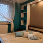 W sypialni łoże sypialniane, szafki nocne, szafa w zabudowie.