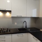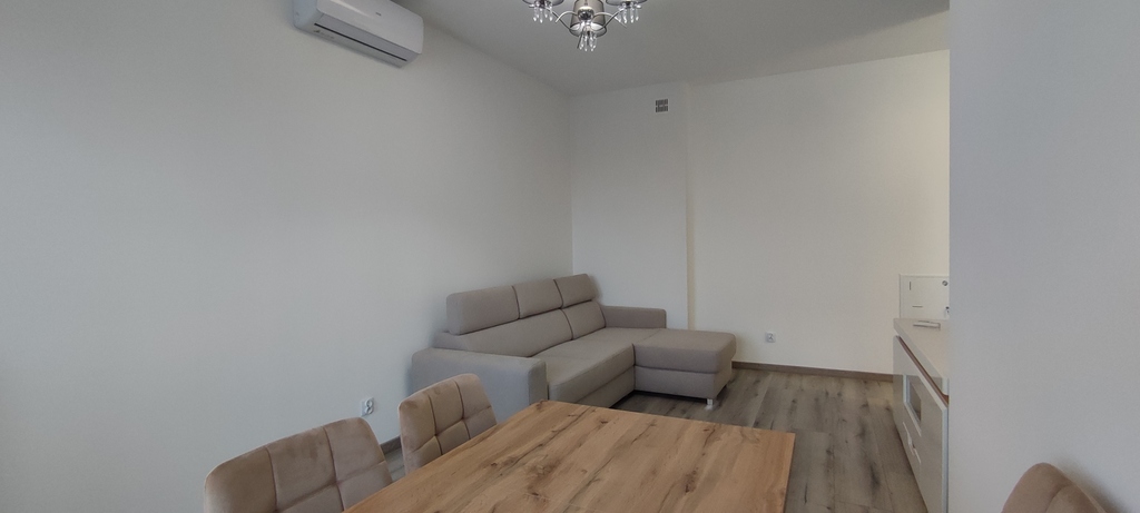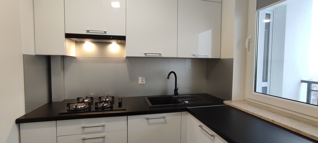 Mieszkanie wykończone na wysokim poziomie. Kuchnia jasna, meble w zabudowie, płyta gazowa, zmywarka w zabudowie, lodówka.