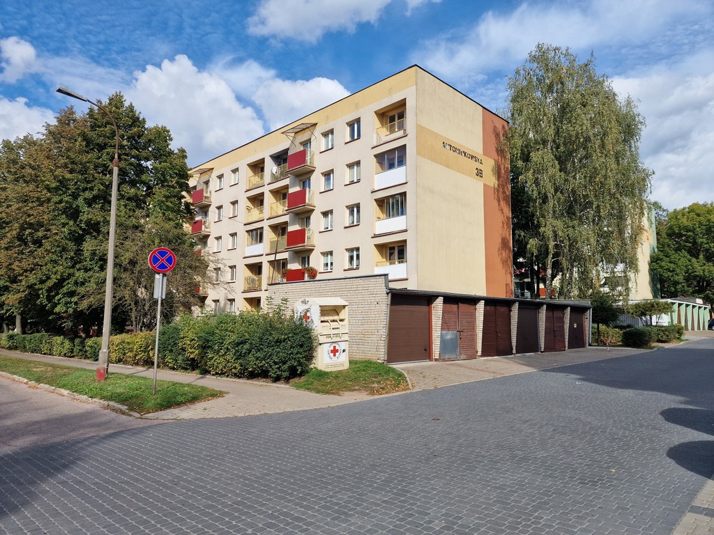 Mieszkanie położone jest na czwartym piętrze w niskim bloku z cegły po termomodernizacji i odnowionymi klatkami schodowymi.