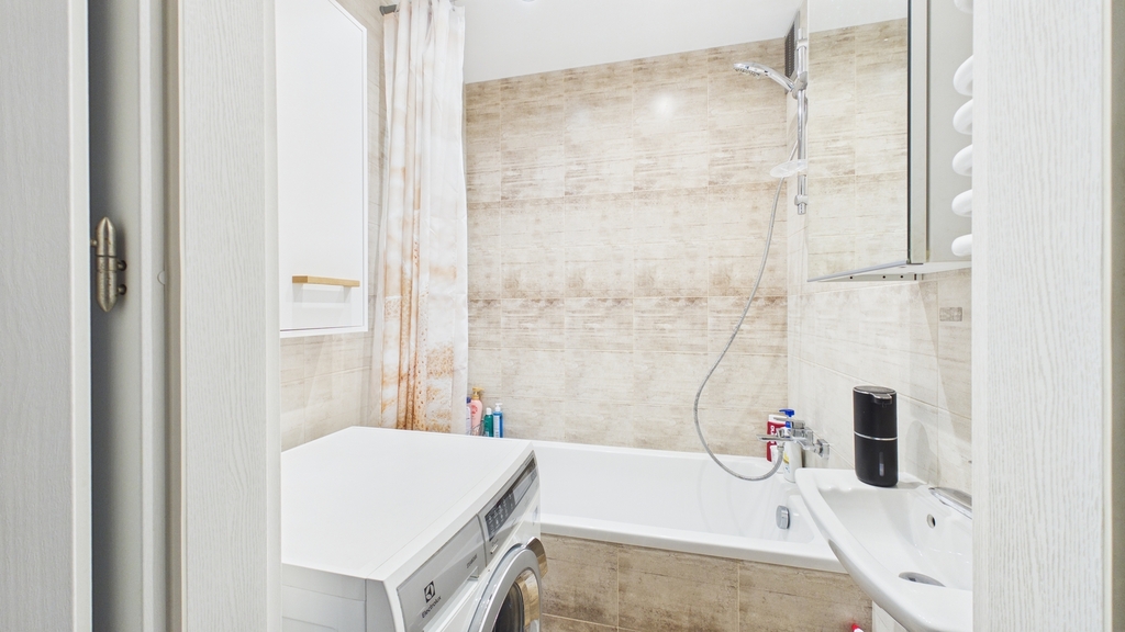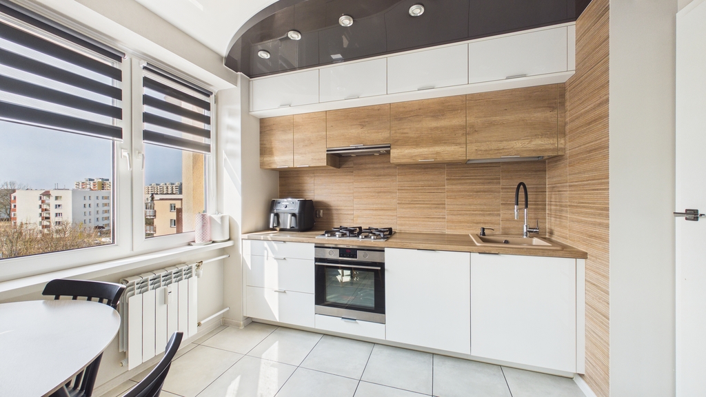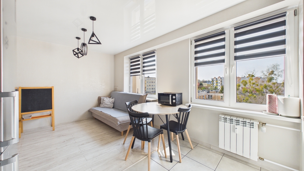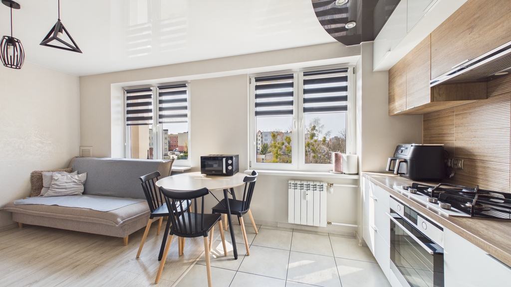 Mieszkanie umeblowane i wyposażone w sprzęt AGD: pralka, suszarka, zmywarka, lodówka.