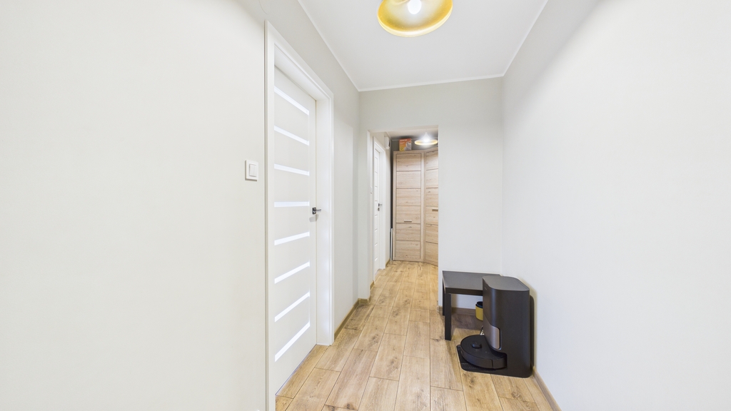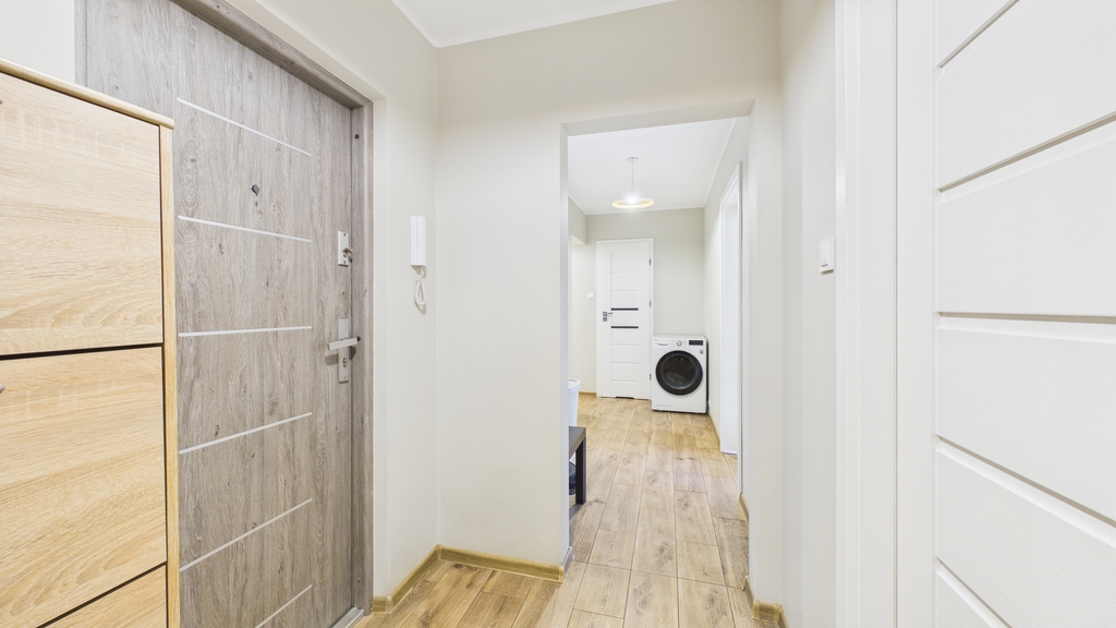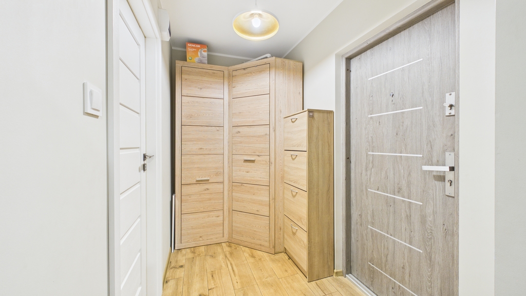 W korytarzu pojemne szafy na ubrania i obuwie.