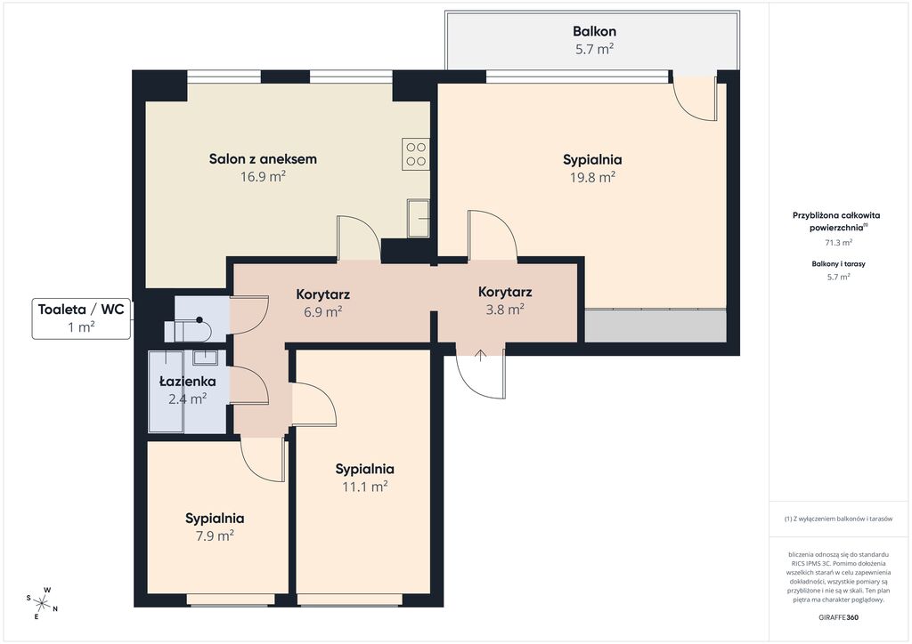 -salon z kuchnią: 16,9 m2 (ekspozycja południowo-zachodnia)