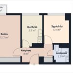 Mieszkanie posiada niezależny układ – wszystkie pomieszczenia dostępne z przedpokoju, co zapewnia wygodę codziennego użytkowania. W skład nieruchomości wchodzą: salon 15,4 m² z wyjściem na balkon, oddzielna kuchnia 5,9 m², sypialnia 7 m², łazienka 1,9 m² oraz przedpokój 4,4 m². Rozkład umożliwia wyraźny podział na strefę dzienną i prywatną.