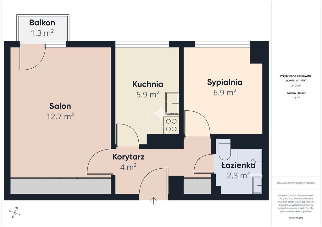 Mieszkanie posiada niezależny układ – wszystkie pomieszczenia dostępne z przedpokoju, co zapewnia wygodę codziennego użytkowania. W skład nieruchomości wchodzą: salon 15,4 m² z wyjściem na balkon, oddzielna kuchnia 5,9 m², sypialnia 7 m², łazienka 1,9 m² oraz przedpokój 4,4 m². Rozkład umożliwia wyraźny podział na strefę dzienną i prywatną.