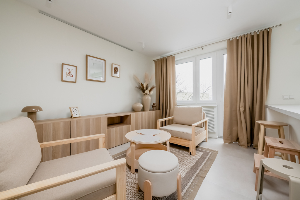 Dodatkowo w mieszkaniu wymieniono absolutnie wszystko: elektrykę, hydraulikę, okna, parapety oraz grzejniki. Zainstalowano również nowoczesne oświetlenie z możliwością regulacji natężenia światła, wygłuszające drzwi wejściowe oraz zasłony zaciemniające, które pozwalają stworzyć idealny klimat o każdej porze dnia.
