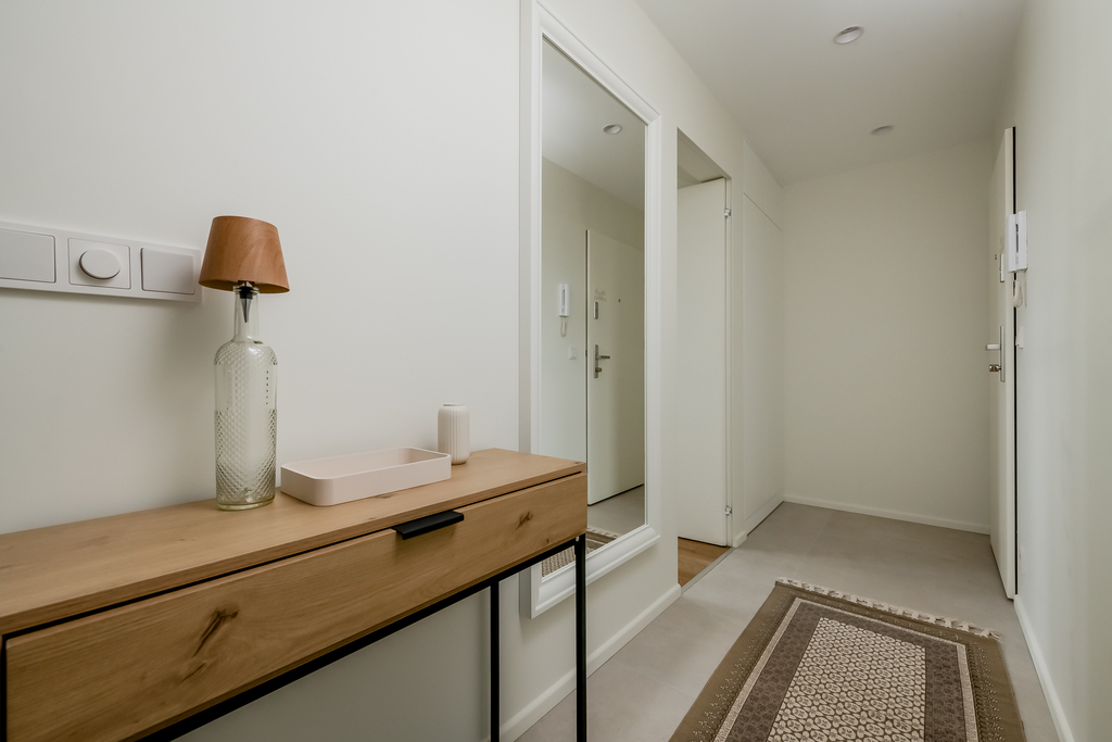 Od progu widać, że mieszkanie przeszło kapitalny remont – zrealizowany z użyciem materiałów premium i nowoczesnych rozwiązań, które na co dzień dają maksimum wygody a pojemne  zabudowy i ukryte systemy przechowywania nadają mu wyjątkową funkcjonalność oraz estetykę.