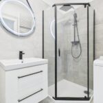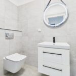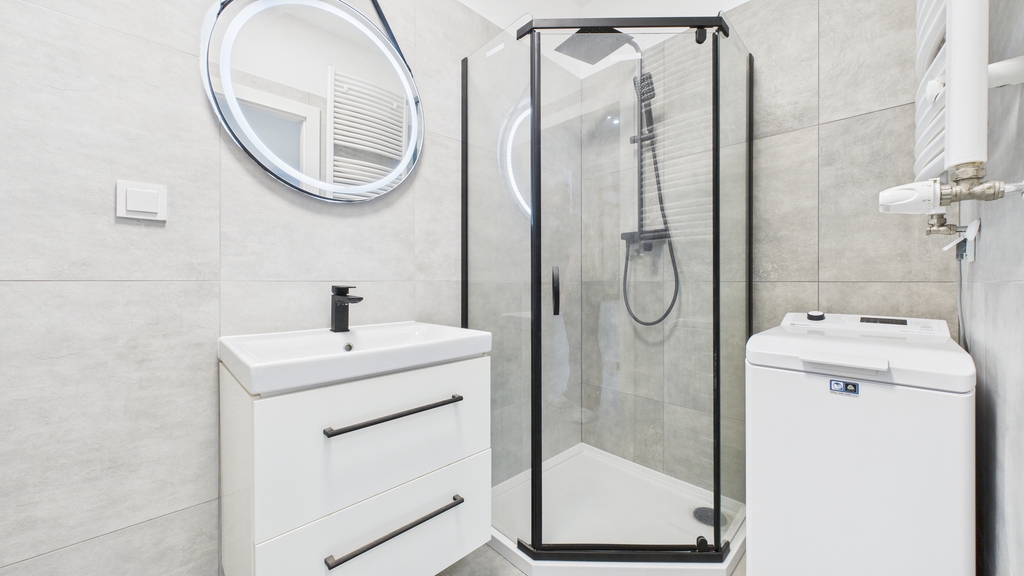 - łazienka z wc: kabina prysznicowa, meble łazienkowe, umywalka, pralka