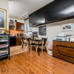 klimatyzacja. Na podłodze w salonie położone są panele o ciepłym odcieniu drewna. Aneks kuchenny wyposażony jest w zabudowę meblową w kolorze ciemnego drewna, która estetycznie komponuje się z płytkami ceramicznymi na podłodze i ścianie.