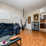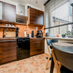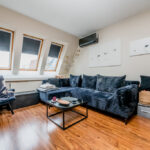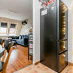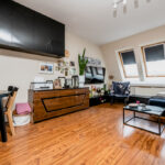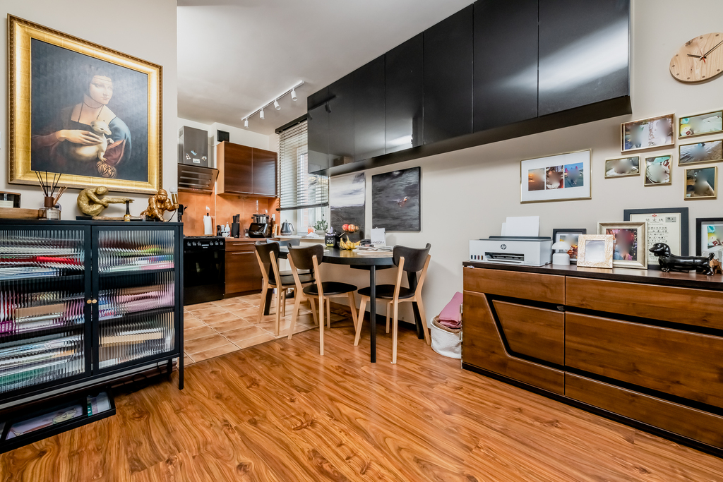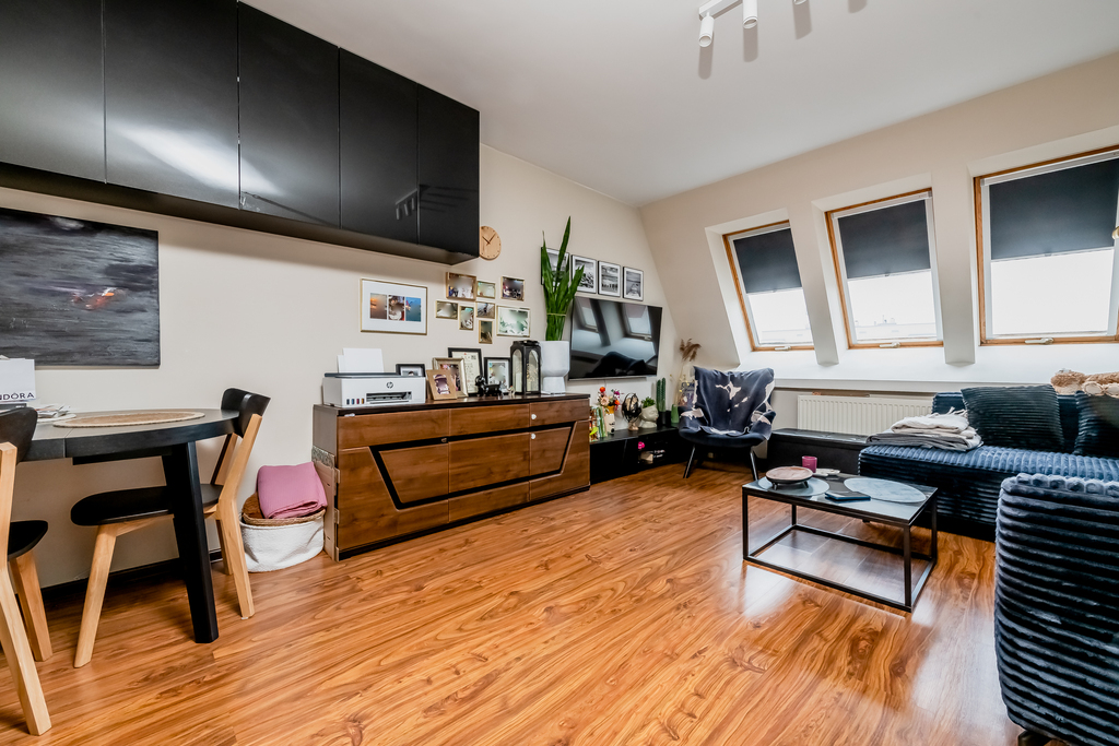 Strefa dzienna i kuchnia: Sercem mieszkania jest przestronny salon połączony z aneksem kuchennym, zajmujący powierzchnię 25.5 m2. Jasność pomieszczenia zapewniają okna połaciowe oraz okno ze ściany bocznej. Komfort termiczny w upalne dni gwarantuje zainstalowana klimatyzacja. Na podłodze w salonie położone są panele o ciepłym odcieniu drewna. Aneks kuchenny wyposażony jest w zabudowę meblową w kolorze ciemnego drewna, która estetycznie komponuje się z płytkami ceramicznymi na podłodze i ścianie.