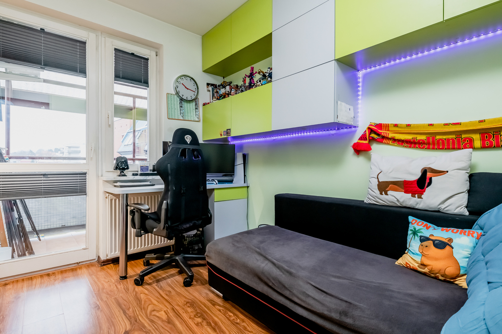 Sypialnia z wyjściem na balkon: Sypialnia 8.8 m2 to ustawny, jasny pokój, który doskonale sprawdzi się jako sypialnia, gabinet lub pokój dla dziecka. Niewątpliwym atutem jest bezpośrednie wyjście na zadaszony balkon o powierzchni 3.5 m2 stanowiący idealne miejsce na poranną kawę.