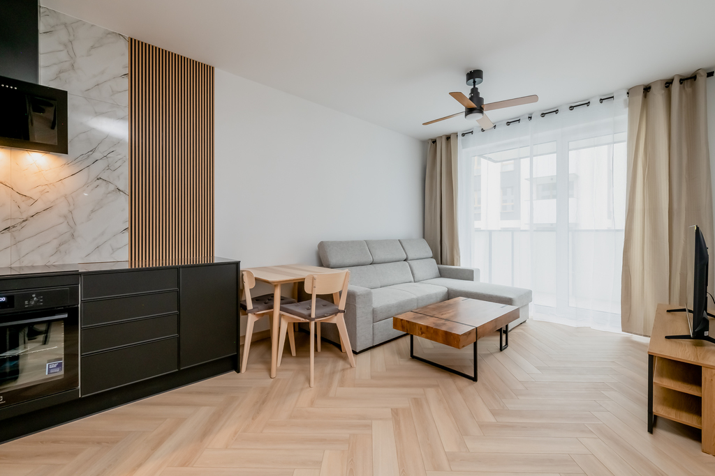 - aneks kuchenny: zabudowa mebli kuchennych, lodówka, płytka indukcyjna, piekarnik elektryczny, zmywarka, stół z krzesłami.