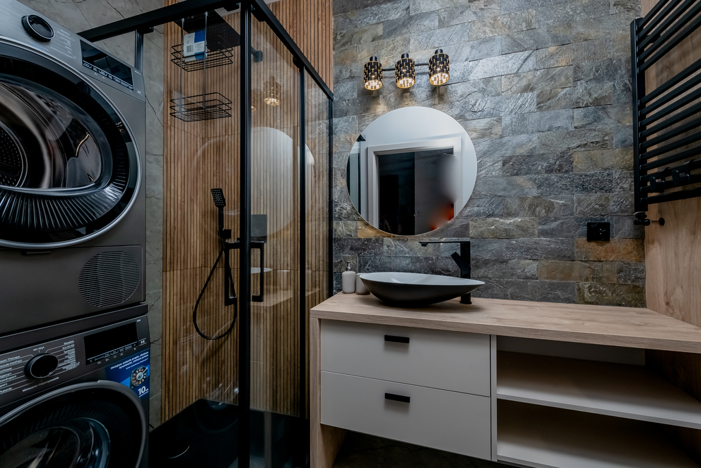 - łazienka z wc: zabudowa szafek, kabina prysznicowa, umywalka z szafką, pralka, suszarka
