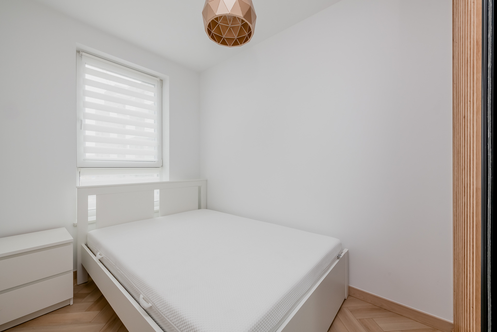 -sypialnia: pojemna szafa, łóżko dwuosobowe z materacem, stolik nocny.