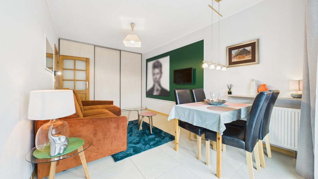 Mieszkanie składa się z:- salon: kanapa rozkładana, zabudowa pojemnej szafy, stół z krzesłami, stoliki okolicznościowe, telewizor