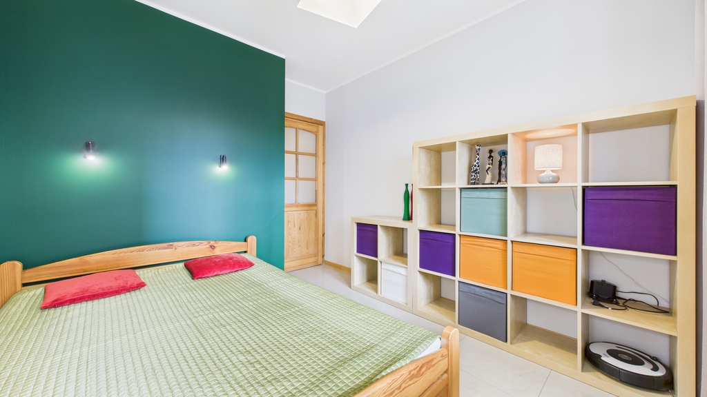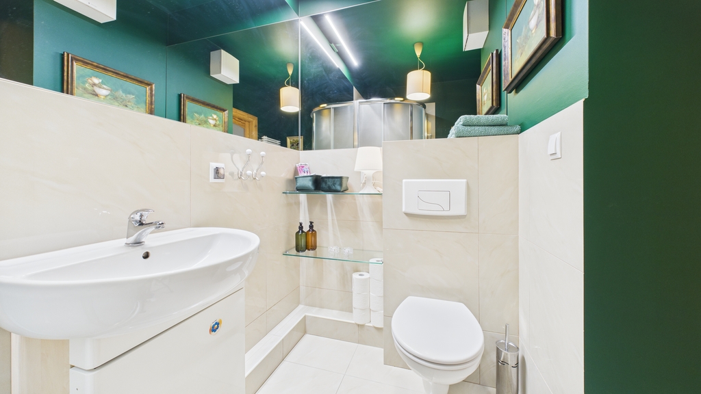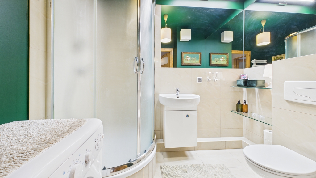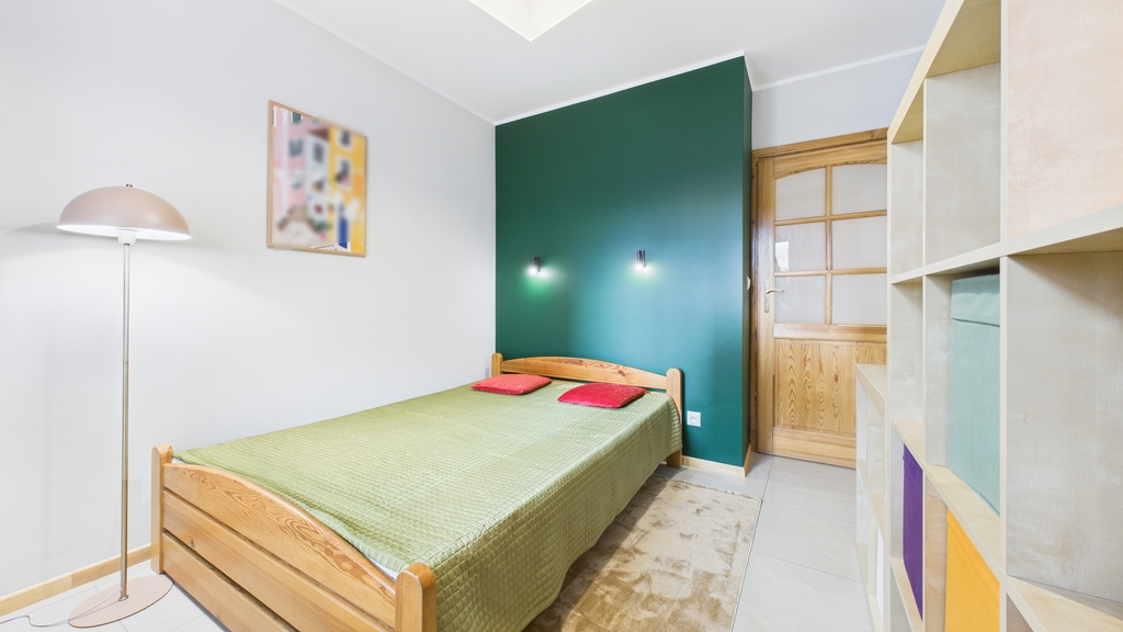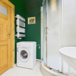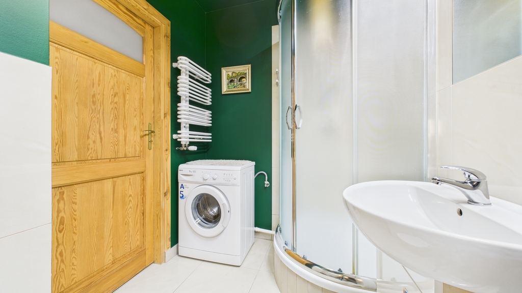 Sypialnia mieści łóżko 2-osobowe z nowym materacem oraz miejsce do przechowywania. Łazienka wyposażona jest w kabinę prysznicową, pralkę oraz szafkę z umywalką.