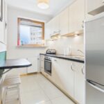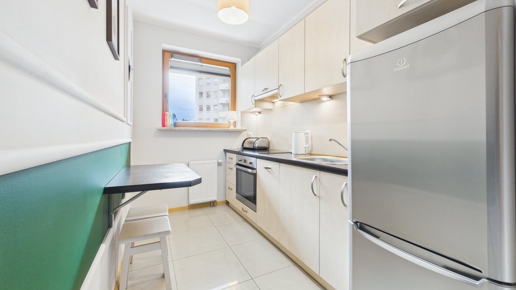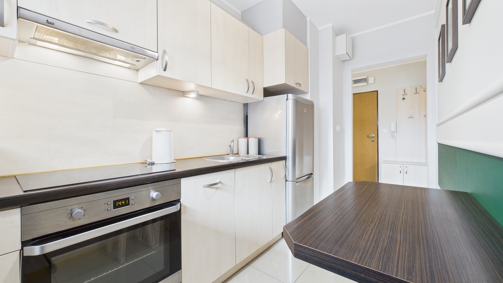 Oddzielna kuchnia z oknem wyposażona jest w zabudowę meblową oraz komplet AGD: płyta indukcyjna, piekarnik elektryczny, lodówka, zmywarka i okap.