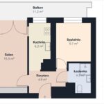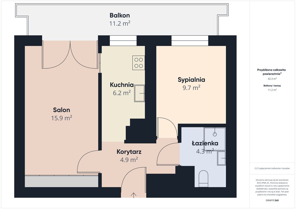 Mieszkanie ma czytelny i funkcjonalny układ: salon 15,9 m² z wyjściem na balkon, sypialnia 9,7 m², oddzielna widna kuchnia 6,2 m², łazienka 4,3 m² oraz korytarz 4,9 m². Wyraźny podział na strefę dzienną i prywatną zwiększa komfort użytkowania.