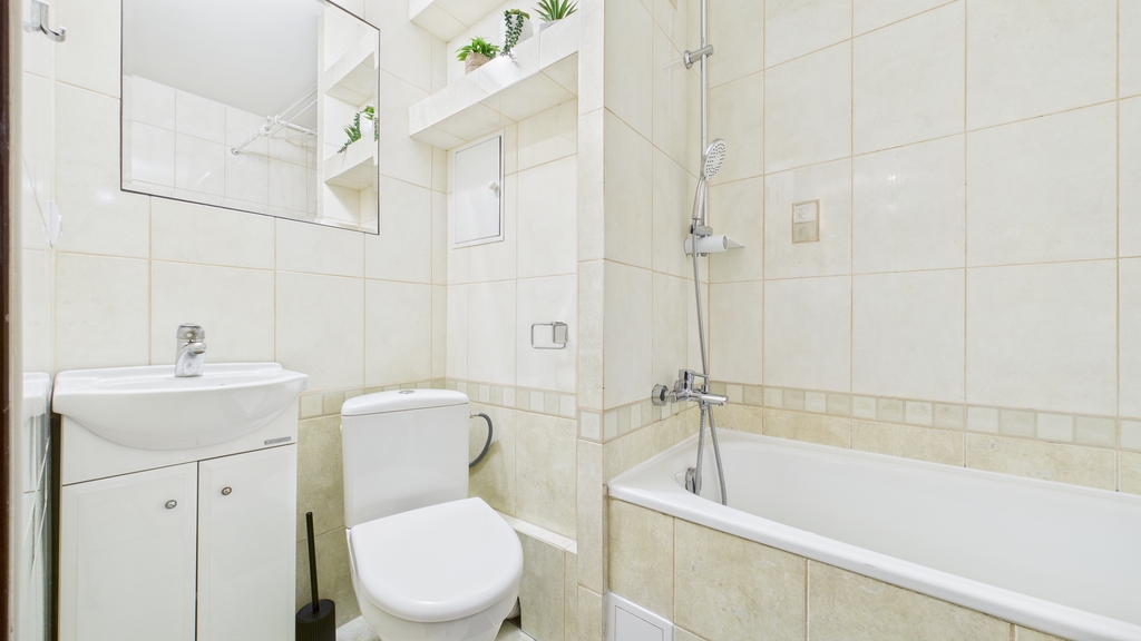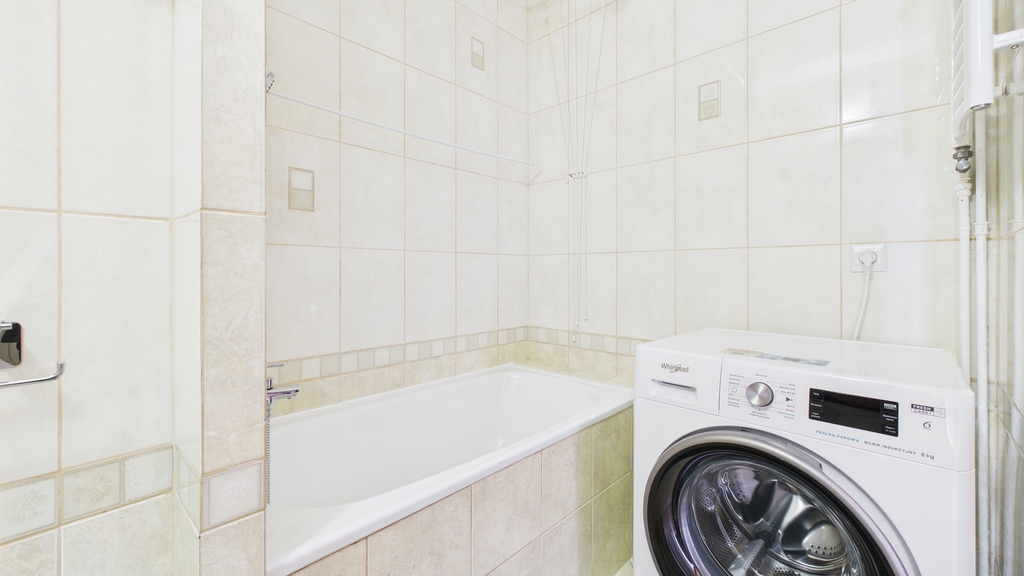 * łazienka (wanna, w-c, umywalka z szafką, pralka)