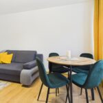 * pokój dzienny (rozkładana kanapa, stolik kawowy, stolik RTV, telewizor, stół z krzesłami)