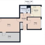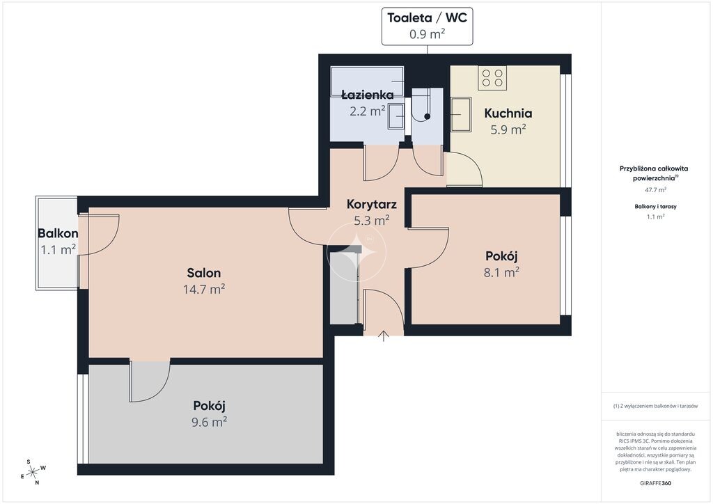 Układ obejmuje salon 14,7 m² z wyjściem na balkon, dwa dodatkowe pokoje (9,6 m² oraz 8,1 m²), oddzielną kuchnię 5,9 m², łazienkę (2,2 m²), osobne WC (0,9 m²) oraz korytarz (5,3 m²). Jeden z pokoi ma charakter przechodni, co daje różne możliwości funkcjonalne w codziennym użytkowaniu.