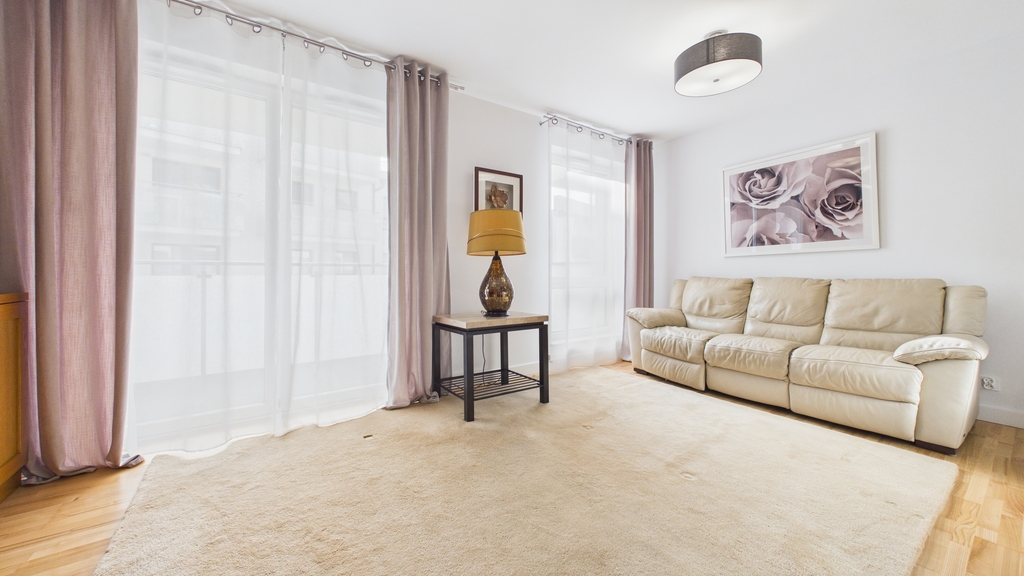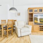 Centralną częścią mieszkania jest otwarta strefa dzienna o powierzchni ponad 34 m², łącząca salon, aneks kuchenny i komunikację. To przestrzeń zaprojektowana z myślą o funkcjonalności – wygodny komplet wypoczynkowy, miejsce na duży telewizor oraz stół jadalniany naturalnie dzielą wnętrze na strefy. Zabudowa kuchenna w nowoczesnym stylu została wyposażona w pełne AGD: płytę indukcyjną, piekarnik, zmywarkę, lodówkę, mikrofalówkę i airfryer. Z salonu prowadzi wyjście na balkon o powierzchni 5,3 m², który stanowi dodatkową przestrzeń do relaksu.