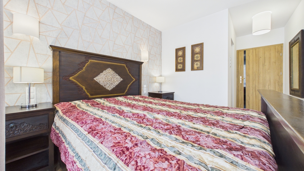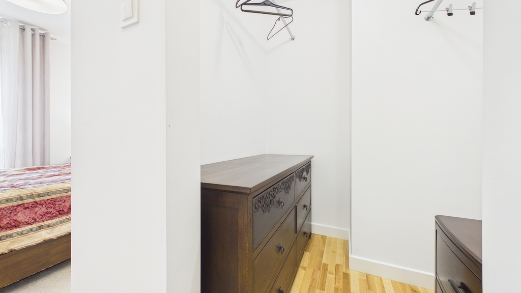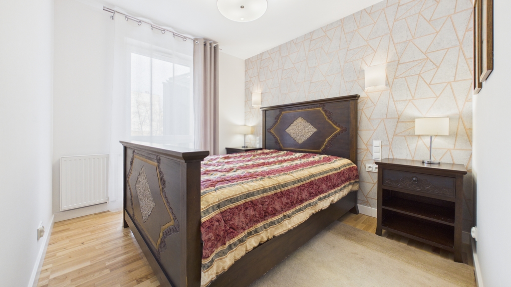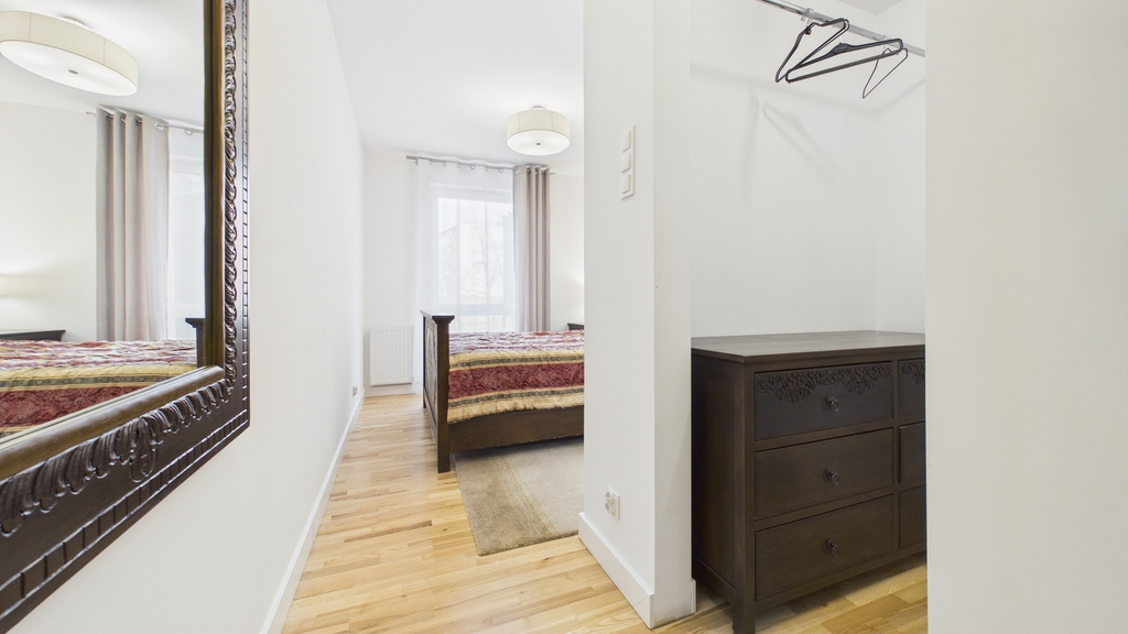 Sypialnia o powierzchni 10,9 m² zapewnia prywatność i spokój. Duże łóżko oraz wydzielona garderoba z komodami pozwalają wygodnie zorganizować przestrzeń. Charakter wnętrza można łatwo dopasować do własnego stylu poprzez zmianę dodatków czy kolorystyki tekstyliów. Łazienka została wykończona w jasnej, eleganckiej tonacji i wyposażona w kabinę prysznicową, zabudowę z umywalką, pralkę i suszarkę.