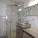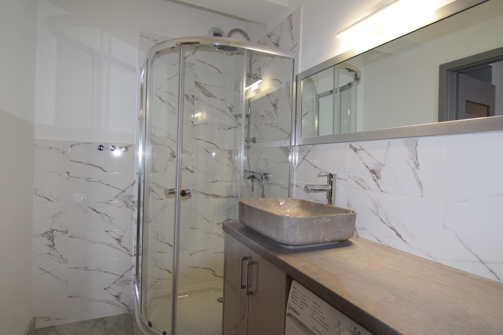 * łazienka (kabina prysznicowa, w-c, umywalka z szafką, pralka)