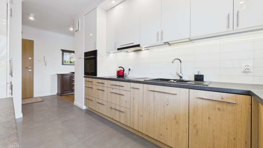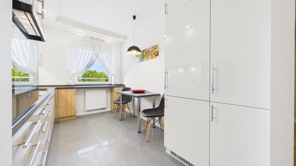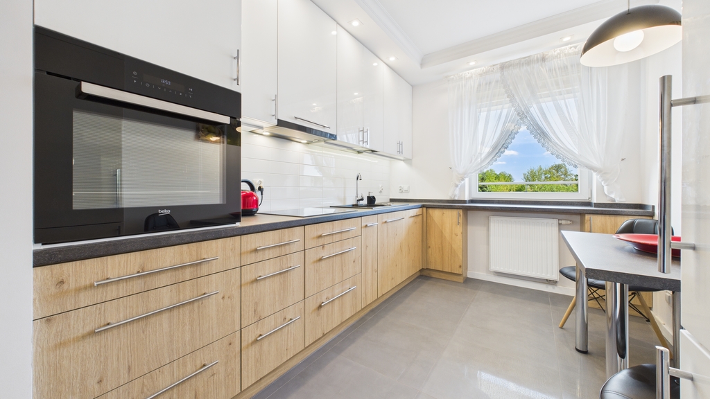 * kuchnia: zabudowa mebli kuchennych, lodówka, zmywarka, płyta indukcyjna, piekarnik