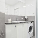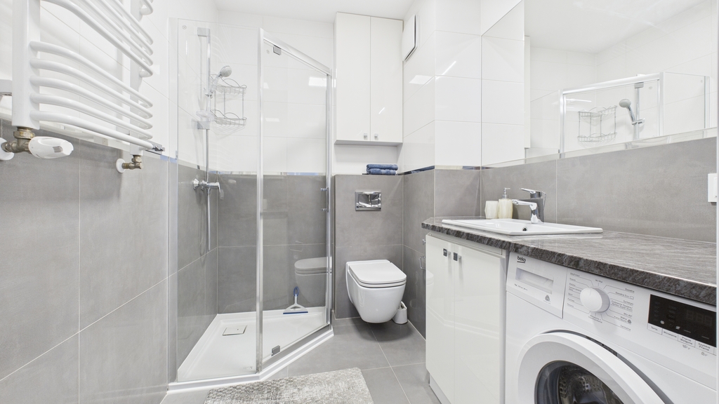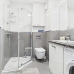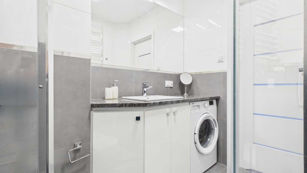 * łazienka: kabina prysznicowa, w-c, umywalka z szafką, pralka