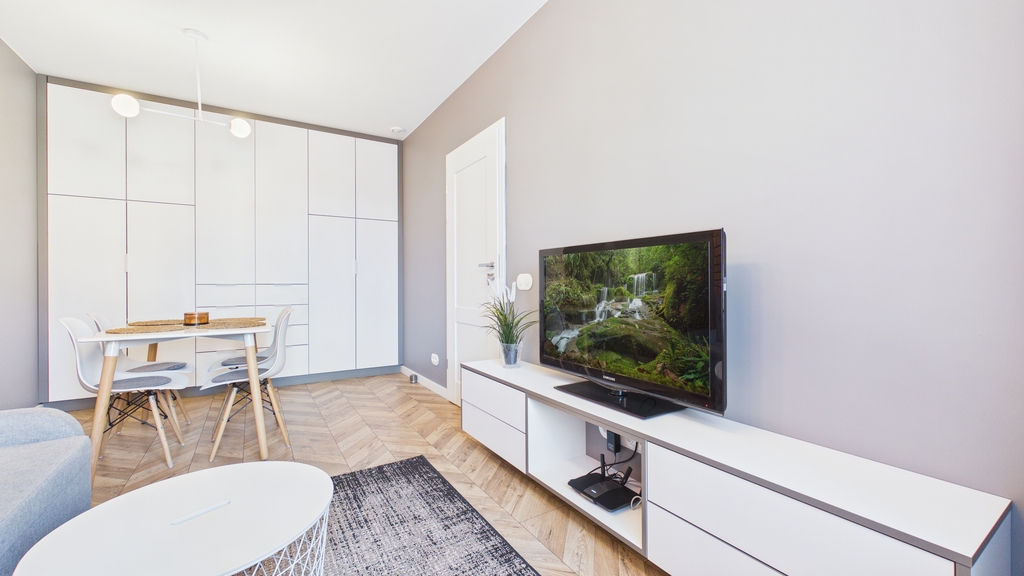 Mieszkanie składa się z:* pokój dzienny (kanapa rozkładana, stół z krzesłami, komoda RTV, telewizor, zabudowa szafy)