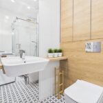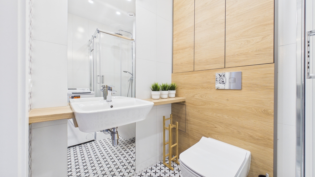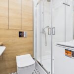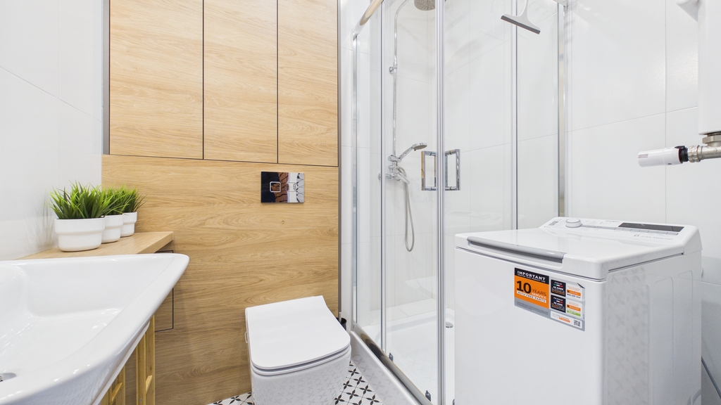 * łazienka z wc (pralka, kabina prysznicowa, umywalka, zabudowa szafek)