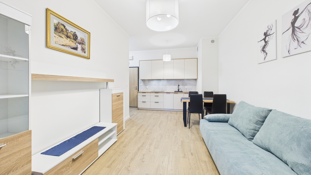 Mieszkanie zostało nowocześnie wykończone z dbałością o detale, spójna kolorystyka oraz przemyślany układ pomieszczeń, który zapewnia komfort i funkcjonalność.