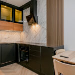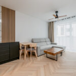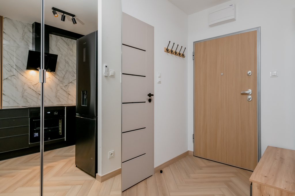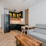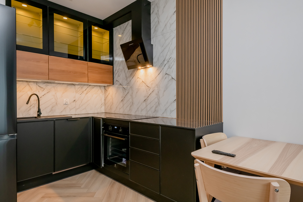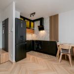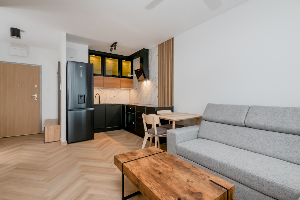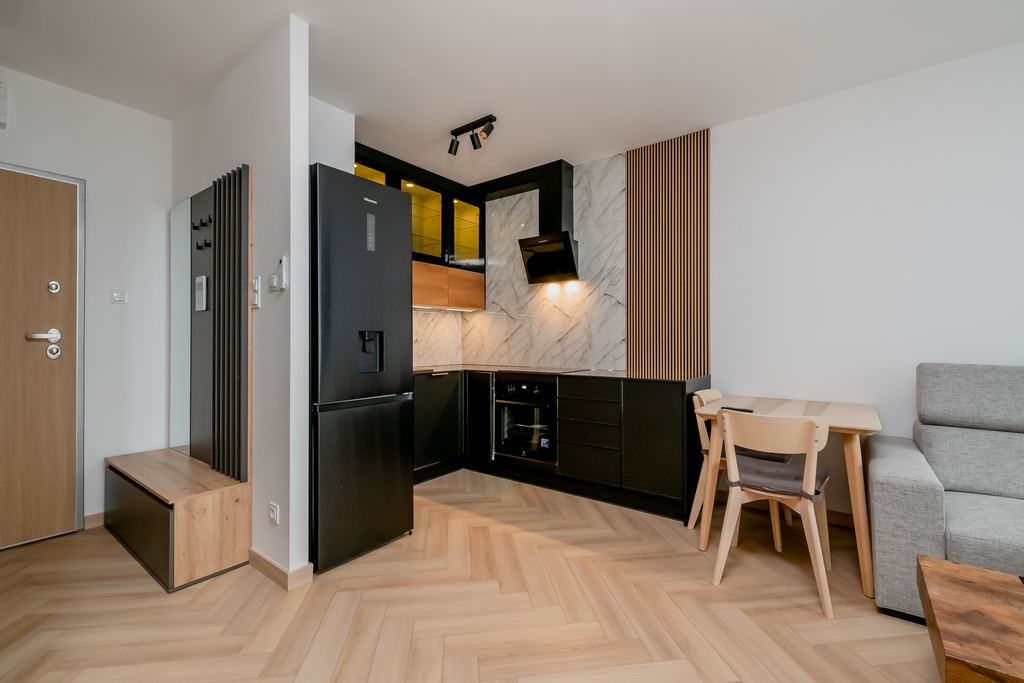- aneks kuchenny: zabudowa mebli kuchennych, lodówka, płytka indukcyjna, piekarnik elektryczny, zmywarka, stół z krzesłami.