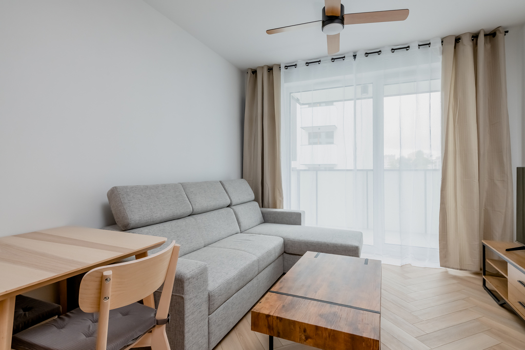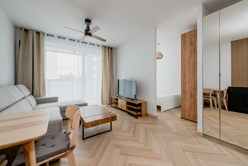 - salon z wyjściem na balkon: rozkładana kanapa, stolik kawowy, komoda RTV, telewizor