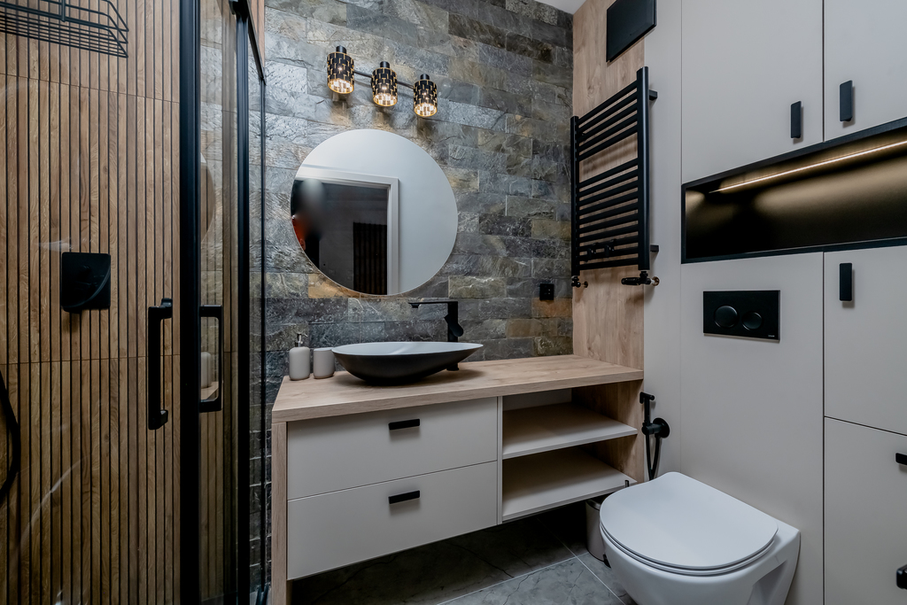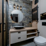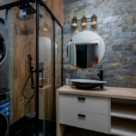 - łazienka z wc: zabudowa szafek, kabina prysznicowa, umywalka z szafką, pralka, suszarka