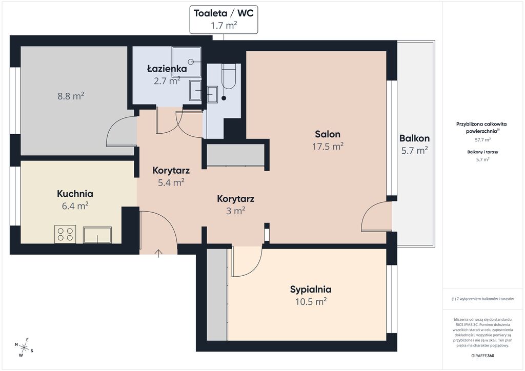 Na powierzchnie składa się :- salon 17,5 m2 z wyjściem na duży balkon 5,7 m2,