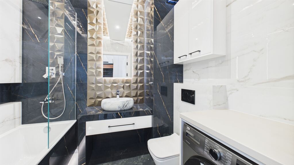 - łazienka z WC, z wanną i meblami łazienkowymi, umywalką oraz pralką