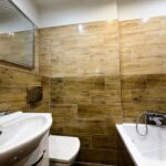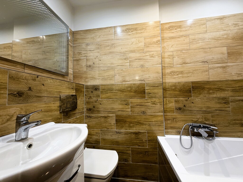 - na podłogach w pokojach panele, w salonie deski drewniane, w kuchni i w łazience płytki