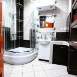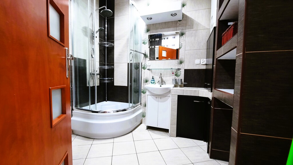 - łazienki wyposażonej w sprzęt sanitarny, kabinę prysznicową i meble łazienkowe za wyjątkiem pralki.