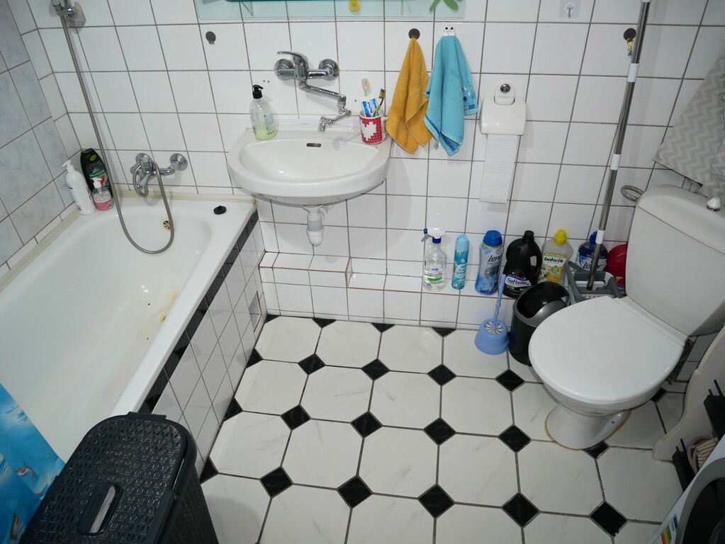 - na podłogach w pokojach panele, w kuchni i w łazience płytki