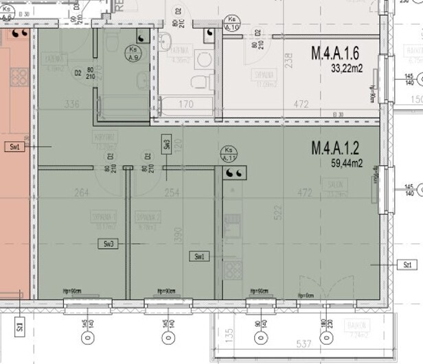 Prezentowana oferta dotyczy mieszkania trzypokojowego nr M4.A.1.2 o powierzchni 59,44 m2 położonego na pierwszym piętrze czteropiętrowego budynku.