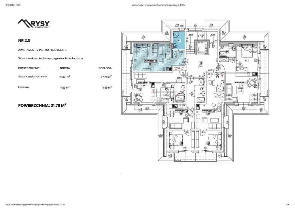 Dwupokojowy apartament inwestycyjny o powierzchni 44,59 m2 zlokalizowany na pierwszym piętrze w budynku nr. 1 inwestycji "Rezydencja Rysy"