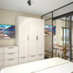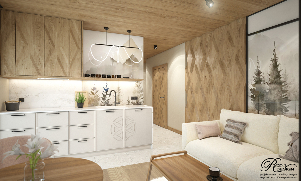 Apartament składa się z salonu z aneksem kuchennym, sypialni i łazienki