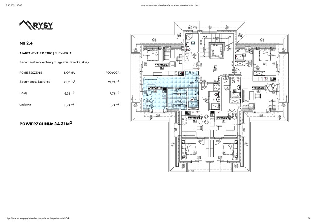 Dwupokojowy apartament inwestycyjny o powierzchni 34,31 m2 zlokalizowany na pierwszym piętrze w budynku nr. 1 inwestycji