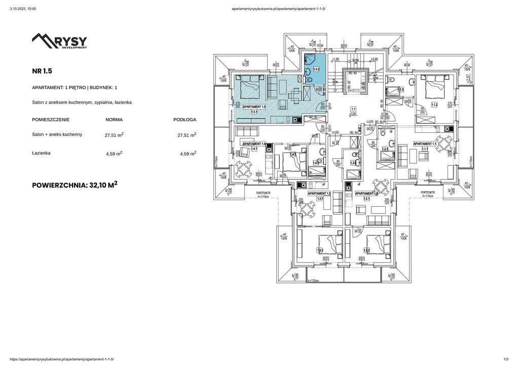 Jednopokojowy apartament  inwestycyjny o powierzchni 32,1 m2 zlokalizowany na pierwszym piętrze  w budynku nr. 2 inwestycji "Rezydencja Rysy"