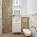 W łazience ubikacja w zabudowie, kabina prysznicowa ze składanymi drzwiami, co daje więcej przestrzeni.