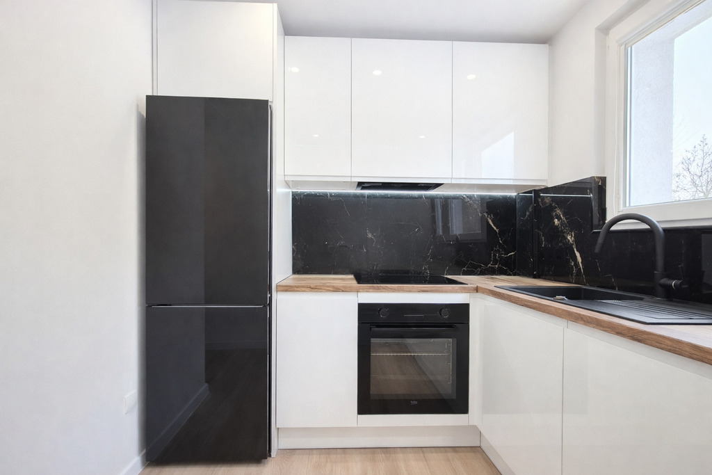 Nowa kuchnia na wymiar wraz ze sprzętami w zabudowie firmy Beko i Samsung (lodówka, zmywarka, piekarnik, płyta indukcyjna).