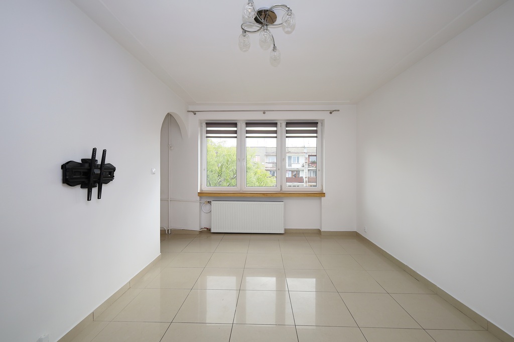 Na podłodze w całym mieszkaniu położone są kafelki, zaś ściany wykończone są gładzią. Duży, jasny pokój daje wiele możliwości zagospodarowania przestrzeni – z łatwością można wydzielić strefę wypoczynkową oraz jadalnianą.