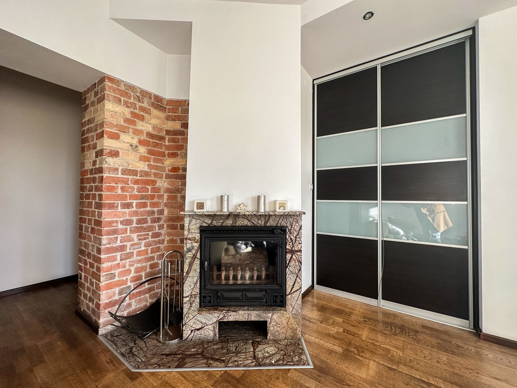 -przestronny salon z kominkiem,