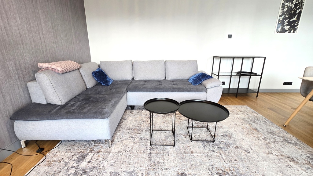 SALON: komfortowy narożnik z funkcją spania, nowy stół z 4 krzesłami.